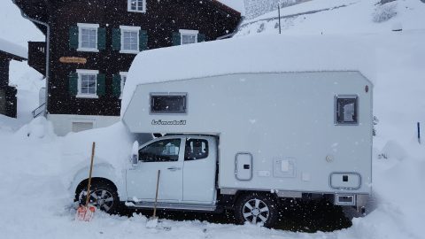 Am Sonntagmittag, bei 80 cm, beginnen wir, das Auto soweit freizuschaufeln, dass wir «mal» wegfahren können. Das gelingt uns in relativ kurzer Zeit bei dichtem Schneefall. Dementsprechend ist unsere Winterkleidung schon völlig durchnässt. Das Wegfahren auf unserem Parkplatz ist wie erwartet kein Problem. Das Problem ist der Schneehaufen auf dem Dach! So ist nicht an eine Heimfahrt zu denken. Der muss runter. Aber wie? Der Camper ist 3 Meter hoch. Mit Beschleunigen und Bremsen bewegt sich da oben nichts. Die Dachluken wirken wie Lawinenverbauungen. Wir brauchen also eine grosse Leiter! Wäre uns das auf einem Campingplatz passiert, wären wir aufgeschmissen, denn in unserer Camperausrüstung führen wir ein solches Hilfsmittel noch nicht. Wir wissen somit, was uns noch zwingend fehlt.