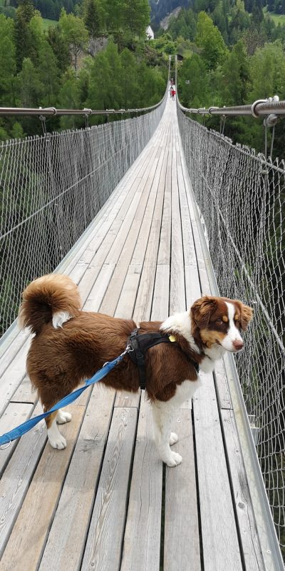 Irgendwo durfte ich auch über eine schwingende Brücke gehen. Das war lustig: Ich konnte sicher und ruhig auf meinen vier Beinen drüber laufen und die Zweibeiner hielten sich verzweifelt am Geländer fest.